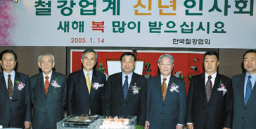 KISA held a New Year's meeting with about 200 people, including representatives from steel and other related industries at the Grand InterContinental Hotel on Jan. 14. The participants included Minister of Commerce, Industry and Energy Lee Hee-beom, POSCO Chairman-KISA Chairman Lee Ku-taek, Park Chan-mo, president of Pohang University of Science and Technology, Yoo Sang-boo, former KISA chairman, Hwang Kyung-ro, ex-KISA chairman, Ahn Byung-hwa, former MOCIE minister, Kim Moo-il, vice chairman of INI Steel, Kim Jeong-il, vice chairman of Dongbu Steel, Chun Kyung-doo, vice chairman of Dongkuk Steel and Shim Yoon-soo, vice chairman of KISA.