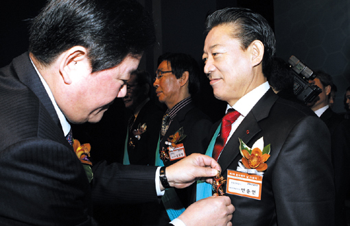 Vice President Byun? Joon-yun of the Korea Electric Power Corp. receives the Industrial Merit Gold Medal from Minister Choi Kyung-hwan of the Ministry of Knowledge Economy for his achievement in KoreaOs exports of nuclear power plants overseas during a ceremony for the first Atomic Energy Day held on Dec. 27, 2010 at the KEPCO building in Seoul.