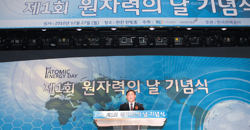 One year has passed since Korea was awarded a nuclear power deal with the United Arab Emirates, the nation's first overseas nuclear power unit construction project. A ceremony to observe the 1st Atomic Energy Day took place on Dec. 27 at the Korea Electric Power Corp. (KEPCO) head office in accordance with the government's decision to designate that day as Atomic Energy Day in celebration of Korea's winning of the UAE project. Among the roughly 1,000 people on hand at the anniversary event were Minister of Knowledge Economy Choi Kyung-hwan, Second Vice Minister of Education, Science and Technology Kim Chang-kyung, KEPCO Chairman Kim Ssang-su, Doosan Heavy Industries and Construction President & CEO Park Ji-won and Hyundai Engineering & Construction (HDEC) President Kim Joong-kyum, along with other representatives from atomic energy-related industries.